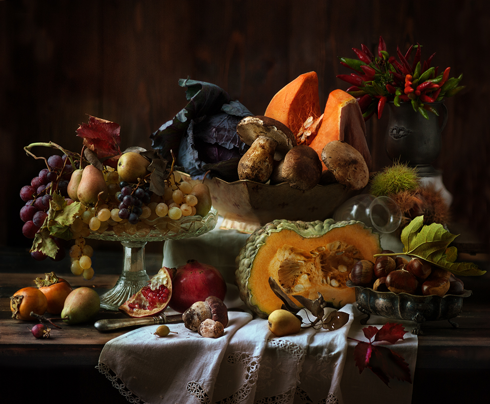 Like many Dutch masters Mystic Light shows a table overflowed with fruit, vegetables, mushrooms and nuts. It could be he got his inspiration from a still life by Jan Davidszoon de Heem, who worked mostly in Antwerp (Belgium). In several ways Mystic Light's photograph resembles the painting.