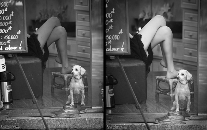 The shoes, and the background are puzzling - as are the smaller, surprise details that we see on looking more closely - but maybe they are part of the story you hope we'll find here. I am not sure if the frame-inside-the-frame is a window or a mirror. The sign is not reversed, so I assume we're looking through a window, perhaps into a beauty salon because the sign seems to be a list of prices, and because of the one word, 'colour' at the bottom. Someone passing the time, waiting with their dog for a hair cutting appointment? That's just a guess.