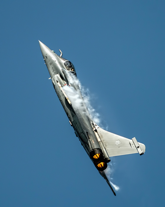 3. Visualisation  of the image has the jet flying past in a turn with the camera pointing into the engine as it moves away. The wings are at an angle of around 30 degrees to the vertical and the top surface of the wings can be seen so that the condensation stands out and the cockpit is visible. In this attitude, it is a compromise between the view of the engine and a sufficient view of the wing surfaces. Opportunities to practice the shot only occur at a couple of airshows during the year so it’s a slow iteration to reach the ideal.